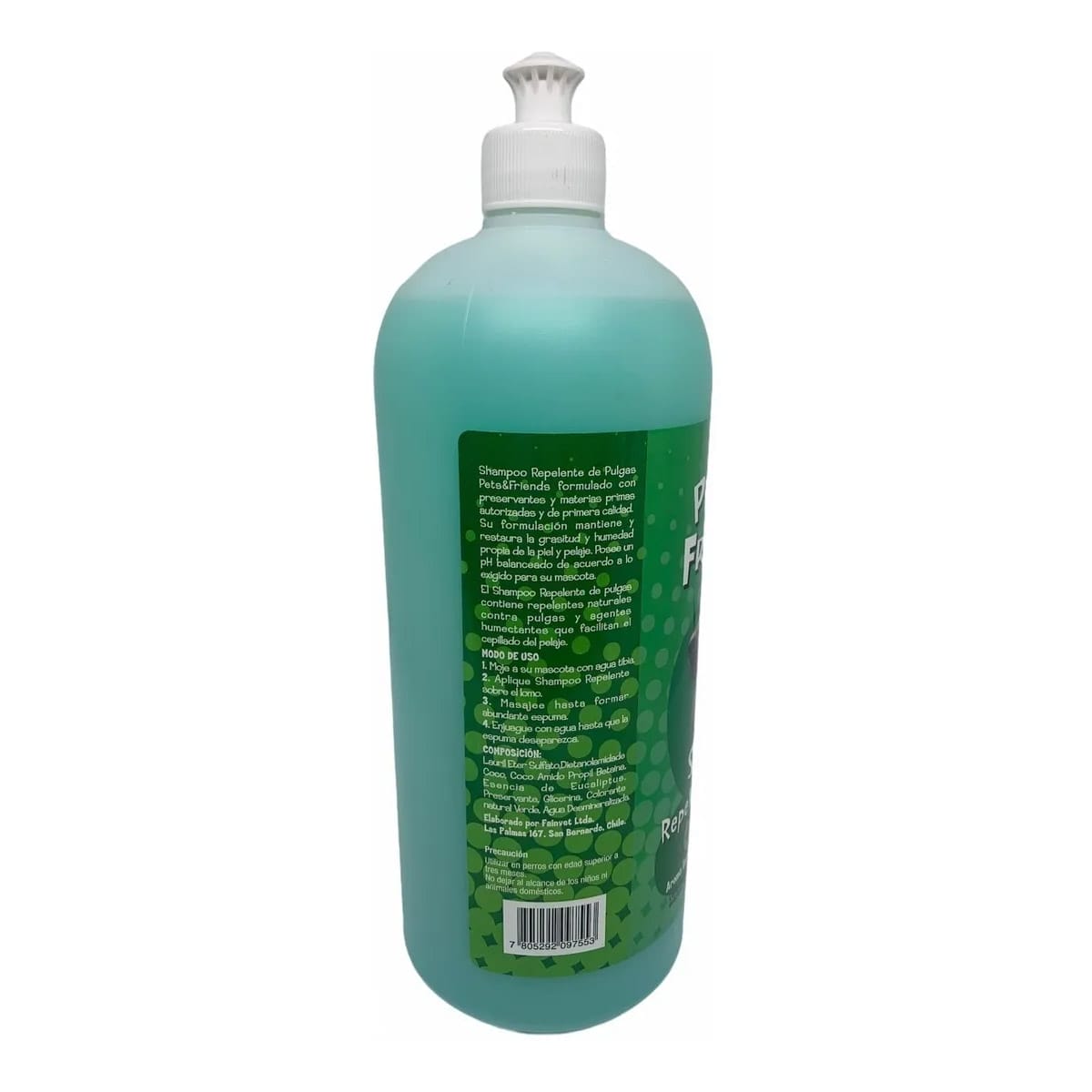 Shampoo líquido repelente de pulgas marca PETS & FRIENDS, elaborado con materias primas importadas de primera calidad en base a esencia de Eucaliptus. Es hipoalergénico, no contiene formalina como preservante ni químicos irritantes. Mantiene y restaura la grasa y humedad propia de la piel y pelaje al poseer un pH balanceado. Este Shampoo contiene repelentes naturales contra pulgas y agentes humectantes que facilitan el cepillado del pelaje